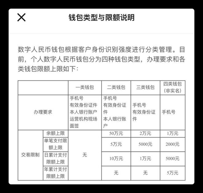 数字人民币钱包将根据客户的身份识别强度进行分类管理,共计四类,分别拥有不同的交易限额。