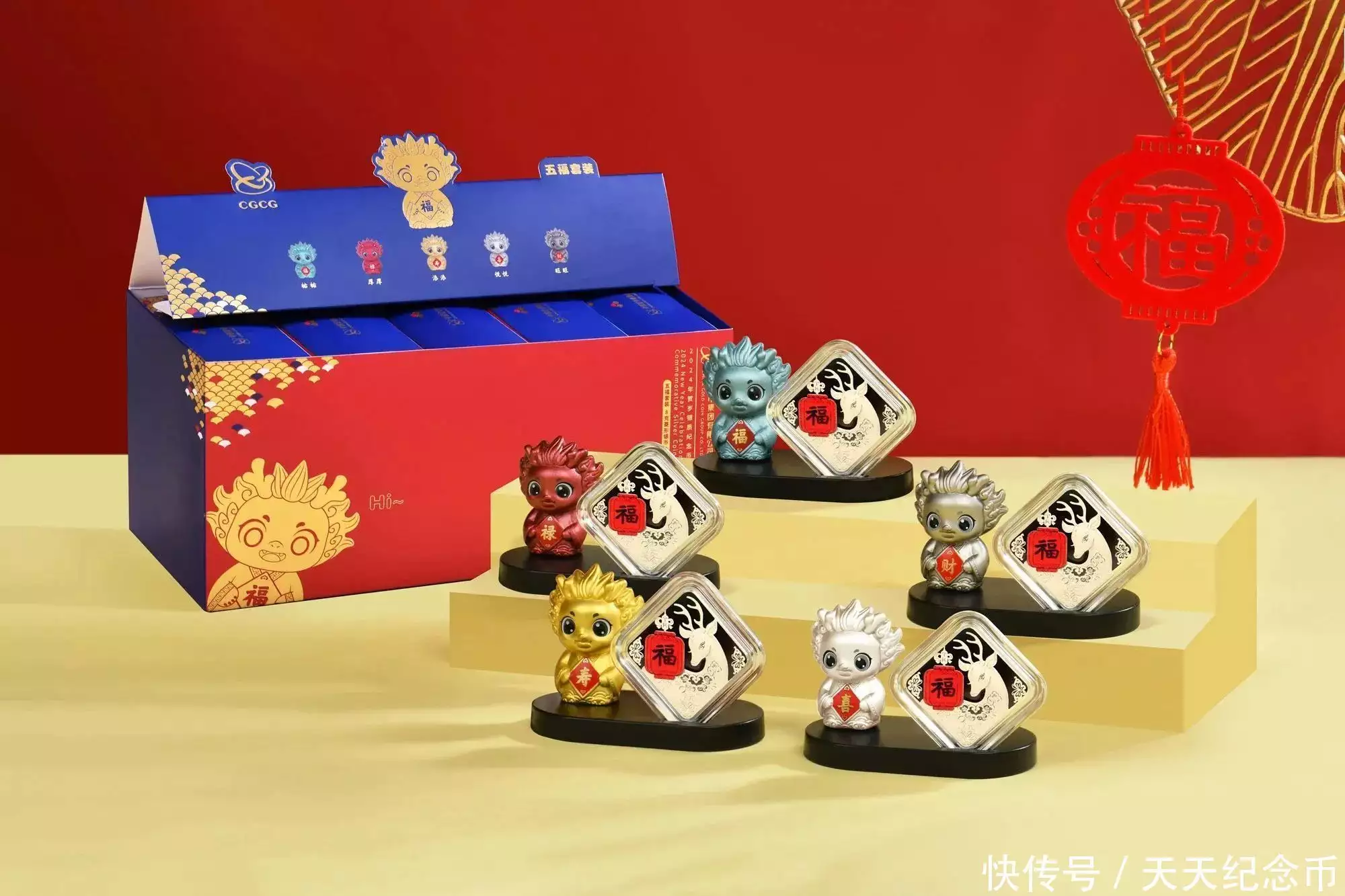 此外,在本次的福字币中,最新引入了盲盒的概念,每一枚银币会带有金木水火土之一的小龙人摆件。