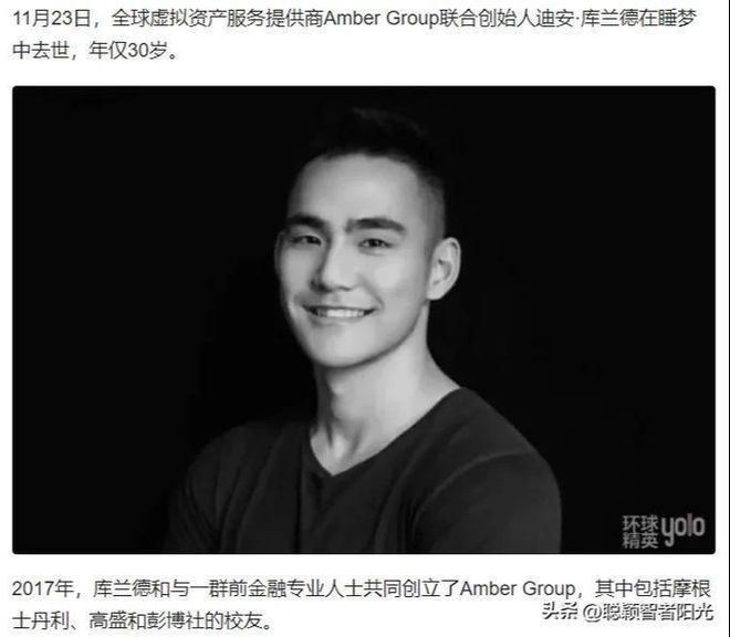 Amber Group联合创始人库兰德睡中死去:2022年11月,全球虚拟资产服务提供商Amber Group联合创始人库兰德 (Tiantian Kullander)于当地时间11月23日在睡梦中去世,年仅30岁。库兰德是一位加密货币领域的知名创业者,曾在摩根士丹利工作。死因尚未公布。
