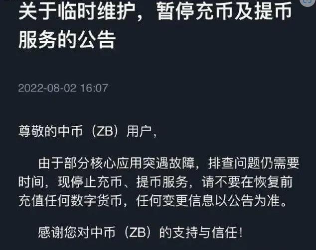 中币(ZB)改名为ZB.com后,专注于国际运营。但是,中币(ZB)并没有因此摆脱困境,反而陷入了更大的危机。2022年8月初,中币(ZB)突然下架了逾100个现货交易对,并在2022年8月2日发布了一则公告,称遭遇故障,暂停所有币种的充值提现。这引起了用户的恐慌和质疑,有人认为中币是在软跑路。