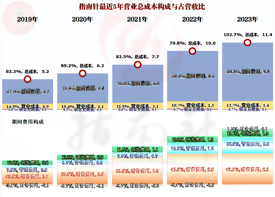指南针的期间费用极高,前几年在营收的七成左右,2023年高达近九成,这就有点严重了,导致其出现了总成本超过营收的现象,也就是主营业务实际上是略有亏损的。