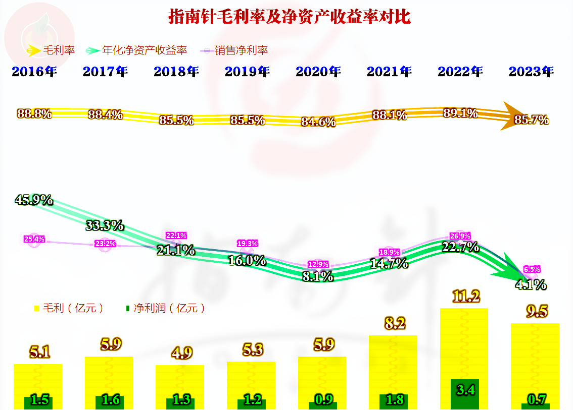 净利润方面的表现,八个季度中五个季度盈利,三个季度亏损,总体上盈利的稳定性较差,似乎指南针已经在离保本点不远的区间维持经营。