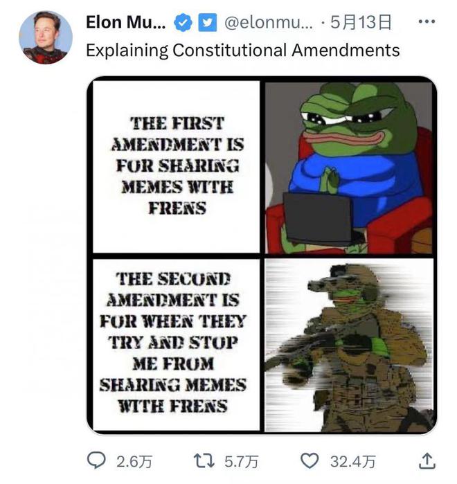 近期,以悲伤蛙表情包为主题的模因代币PEPE,席卷“币圈”。5月13日,马斯克在推特上发文并附图Pepe形象表情包,据行情数据显示,PEPE随即上涨约10%,24小时涨幅超50%。
