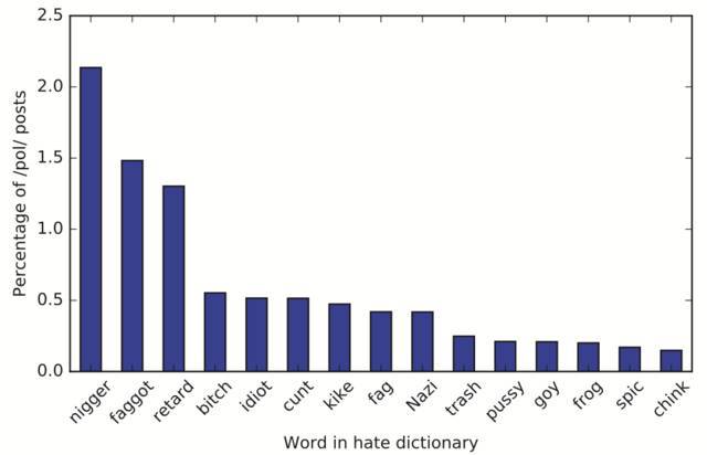詹卢卡和他的合作伙伴对/pol/版面中超过800万条帖子进行了分析和整理,试图从中发现一些端倪。他们将关注点聚焦在“仇恨言论”(Hate-speech)的产生和传播上。这些言论的发起者使用明显攻击型的语言来表达自己的观点。他们发现了一些值得注意的规律:
