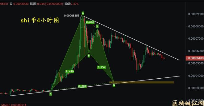 ShiB价格在之前的大涨后开始泄气了,目前走势以0.886回调的蝙蝠形态为主,高点的趋势压力线为压力,狗币这次上涨没有带动上涨,那么等待形态的完成或者支撑线即可。关注0.000034美元附近支撑。