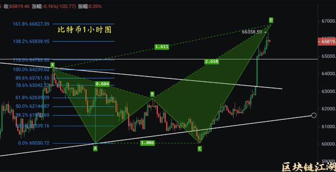 言归正传,比特币价格以高位震荡的收敛三角向上突破确认了强势的局面,大饼吸血属性加持,比特币一举突破加特利形态0.786位置的64800美元附近,若比特币价格持续推动,那么比特币可能会去完成1.618的螃蟹形态,即比特币价格可能会去试探73000美元附近。目前比特币很强势,突破新高应该不是问题。短期走势比特币调整后还会向上突破,试探1小时图的1.618位置66800美元附近压力,然后回调试探支撑然后再向上突破。当然,如果跌破短期支撑也不要怕,以收敛三角下沿线为支撑仍能保持上涨姿态!