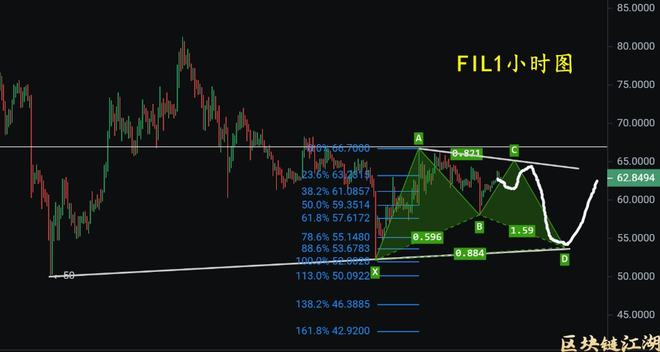 Filecoin又名“废儿”,一方面是国内矿场出海,大多FIL矿工都在国内;另一方面是币种相关的应用还不够完善,这枚币种的价值体现需要时间等待。从走势而言,FIL价格虽然有所起色,但对比比特币以太坊还是相差太大,且FIL价格可能会在65.1美元附近受到一定阻力,然后完成AB,CD0.886的调整,正好符合从50美元以来的支撑线,等FIL完成CD调整后大概率在53-54美元附近可考虑入场。