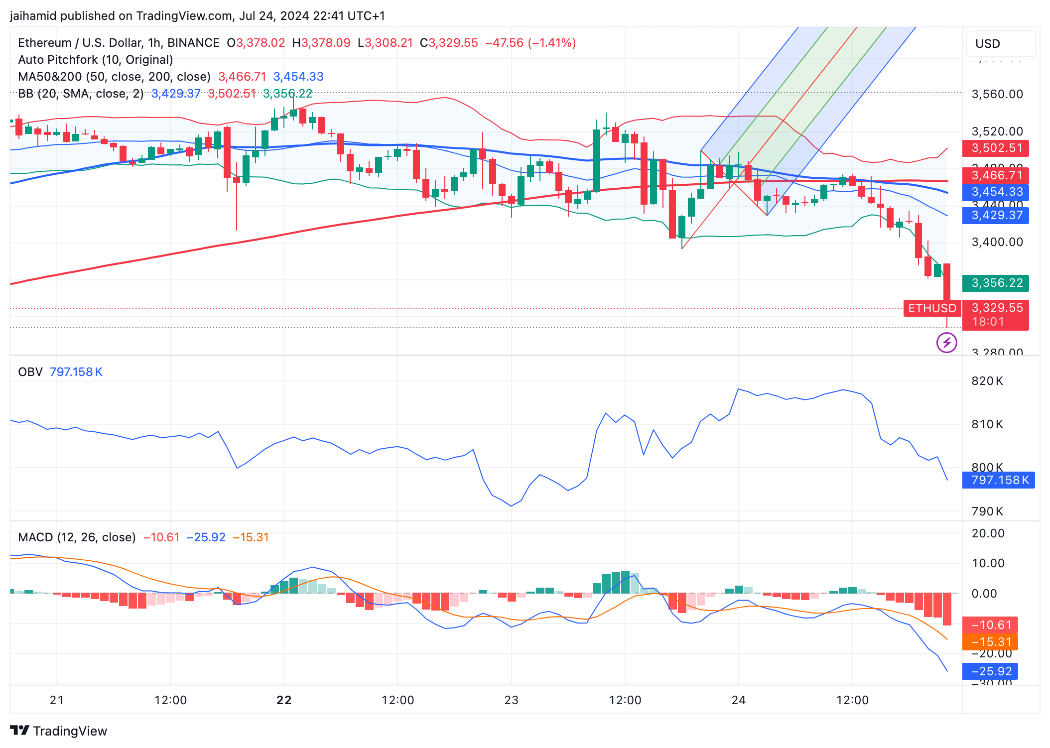 截至发稿时,以太坊的交易价格约为3329美元,比之前的水平下跌1.42%。这一下跌使价格接近关键支撑位,尤其是3300美元左右。