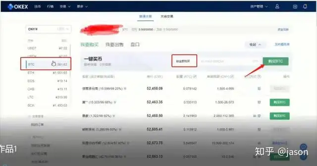 2、进入这个界面后,在左边选择BTC,然后旁边的 一键买币 选择 按金额购买(推荐使用这个),然后在点击旁边的按钮 购买BTC