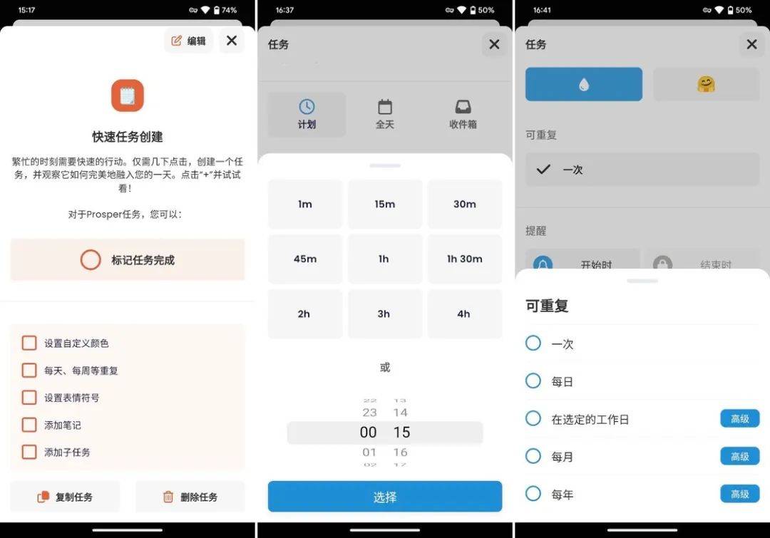 在设定持续时间时,Prosper 也有一定的小巧思,它将一些常用的时间长度直接罗列出来,方便我们点击选用,避免了每次都要滚动选中。一旦设定好开始时间,应用便会结合持续时间自动为我们计算出结束时间。Prosper 允许我们设定重复,但是如果你希望充分自定义重复频率或是提前获取提醒,那么也需要付费解锁高级版。当然,对于一般用户而言,Prosper 的免费版本已经足够使用。