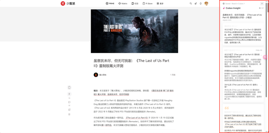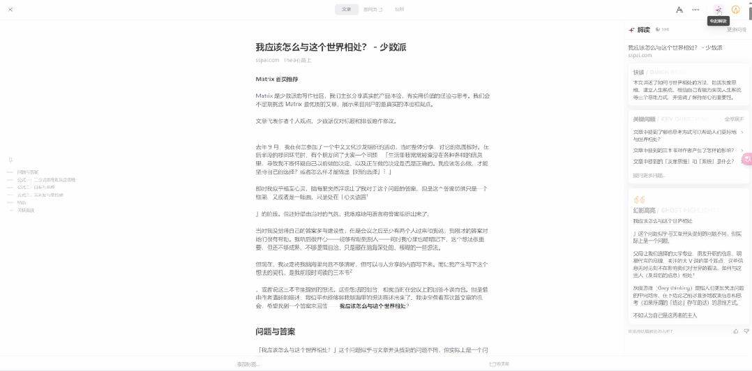 首先,Cubox AI 2.0 主打的一个功能叫做 Cubox Insight,可以帮助我们对收藏网页的内容进行深入的解析。得益于 Cubox 的全平台覆盖特性,不管是我们手动将文章添加到 Cubox,还是通过浏览器插件直接对网页上的文章进行操作,都可以通过 Cubox Insight 获取解读信息。Cubox Insight 将解读信息分为了三大类,Quick Read 会对文章内容进行总结概述,让我们可以通过一段话就快速了解文章的概要;Key Questions 会针对文章中的主要观点进行提问并回答,让我们直接掌握大家最关心的话题;Ghost Highlights 则是对文章中值得阅读的精彩片段进行自动摘取,可以在阅读界面对其进行直接高亮操作,减少了找精彩片段、划词这两步操作。
