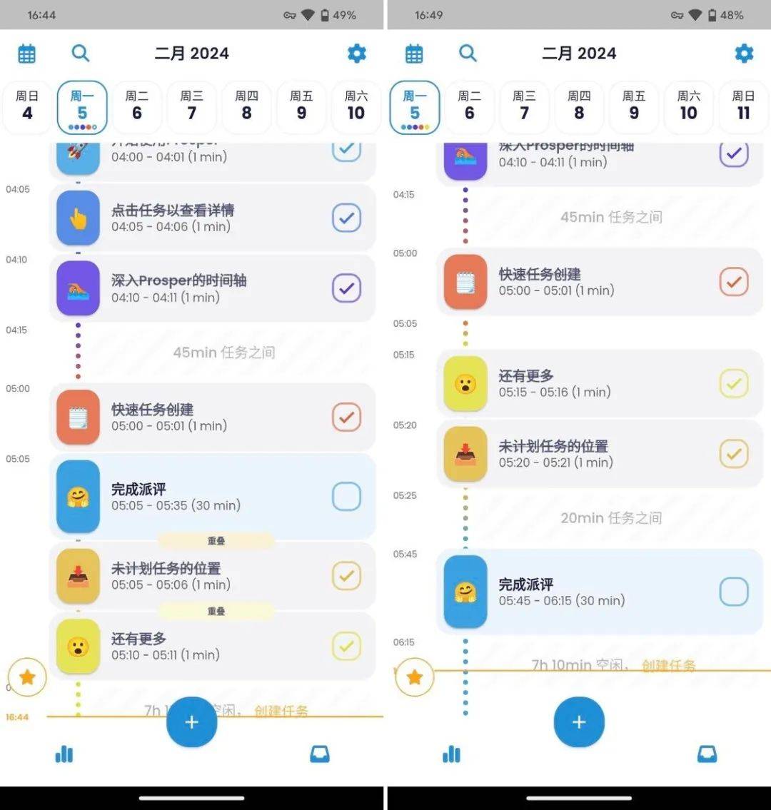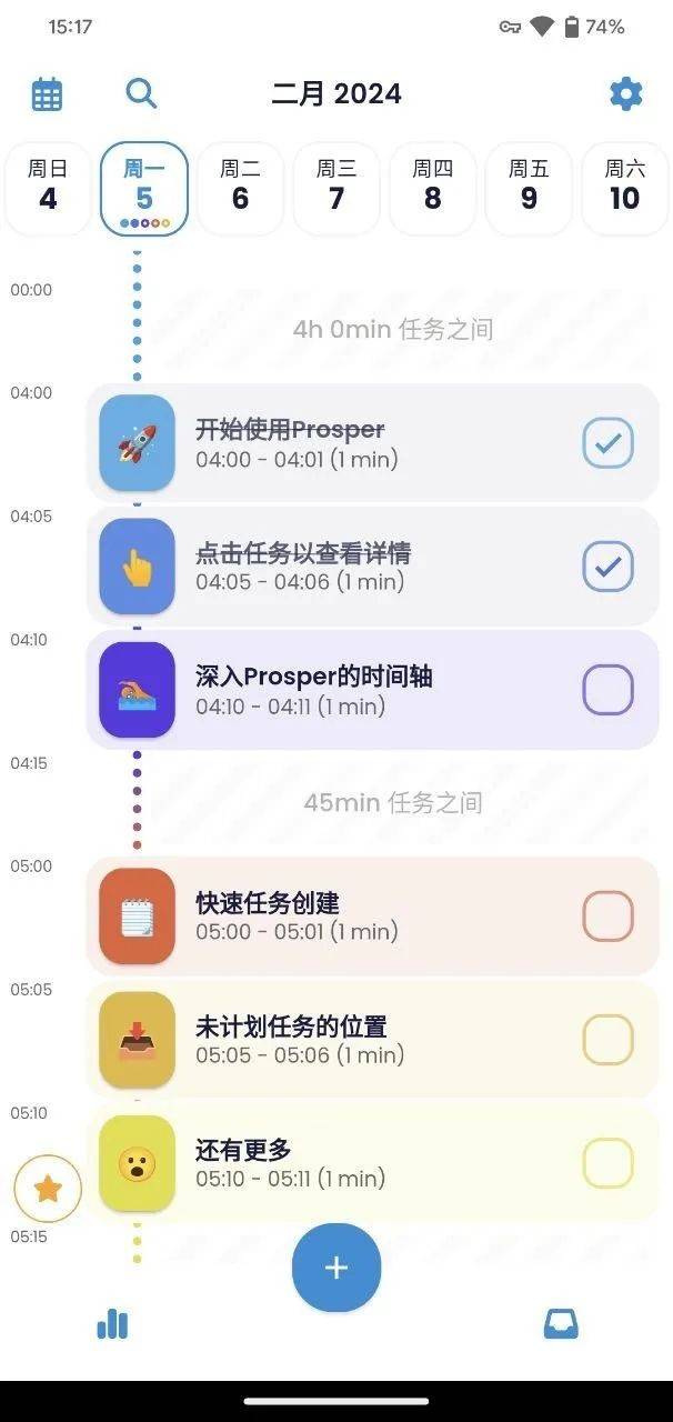 Prosper 的基础功能很简单,就是结合时间轴和日历界面实现任务管理及日程规划的融合。Prosper 将时间轴作为主界面呈现,使得我们的各项任务及日程得以清晰地呈现,同时也方便我们查看一天当中的空闲时间,从而了解相隔时间较远的任务之间的空档。