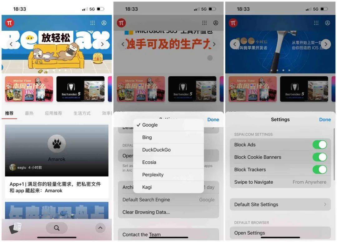 如果你并不习惯 AI 搜索方式,Arc Search 依然提供了传统的浏览器功能。搜索框中直接输入搜索词或网址,点击键盘上的「前往」,即可跳转应用默认的搜索引擎和对应网址;你可以点击右下角向上的箭头,打开系统设置更换默认搜索引擎。此外,Arc Search 内置了广告、Cookie Banner 和跟踪器拦截功能,你无需再安装额外扩展,即可享受相对干净的页面。