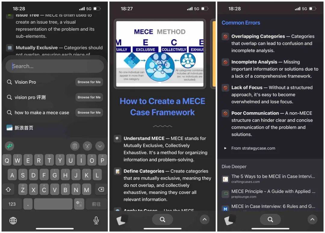 移动端浏览器最是讲求效率,希望可以输入最简短的提示词,获取最全面的信息,而不用手动在结果条目间来回寻觅,又或是被各种应用套娃跳转。Arc Search 的交互设计就是围绕「搜索效率」这一点展开,当你在搜索框中输入问题或提示词,点击输入框下方的「Search for Me」,应用会自动筛选多个相关网页的重要信息并汇总,最终形成一套条理十足且排版精细的结果:首先答疑要点,其次解释相关细则或给予例证,最后筛选出具有强相关性的网页链接,方便你自行进阶阅读。